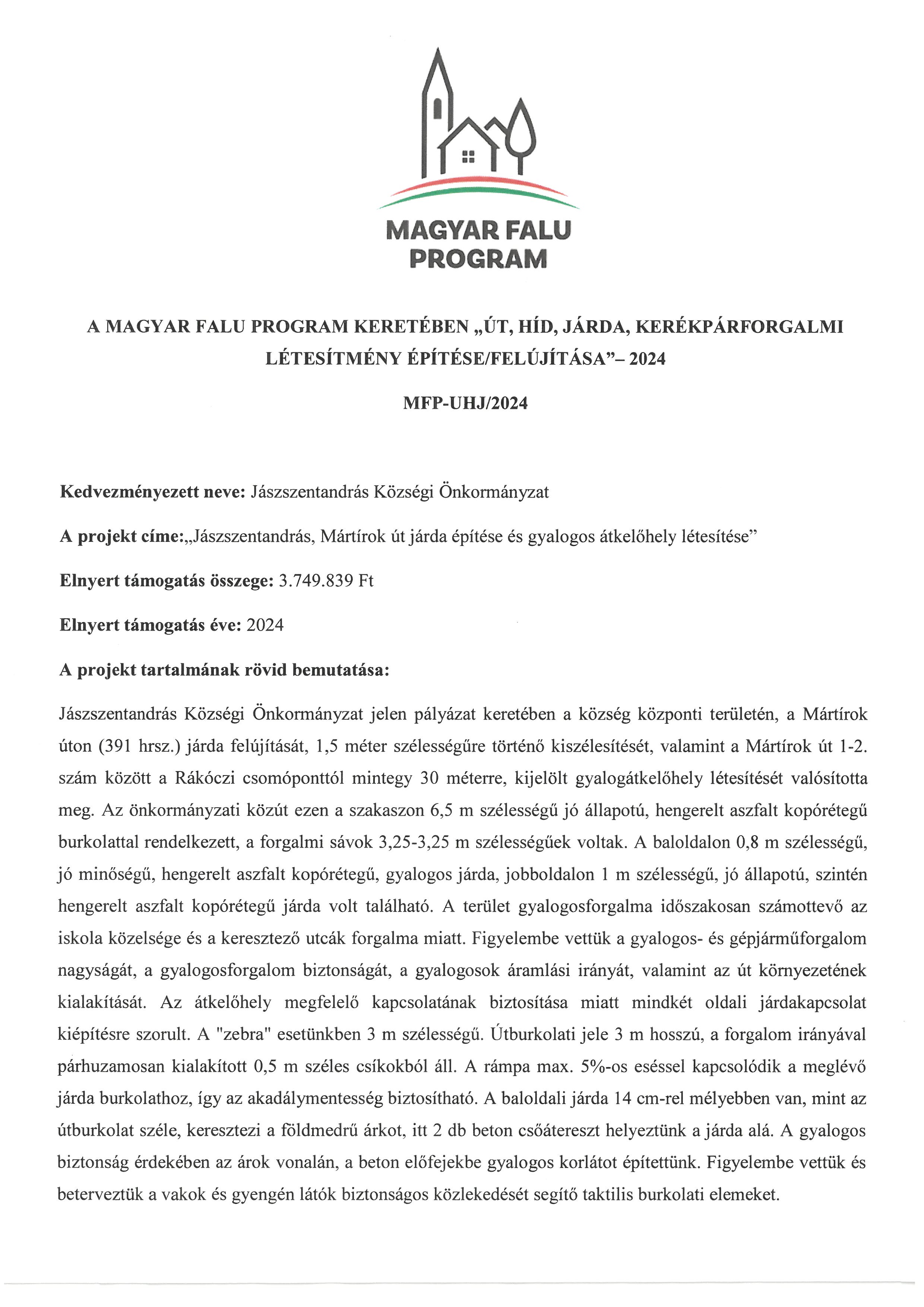 A MAGYAR FALU PROGRAM KERETÉBEN "ÚT, HID, JÁRDA, KERÉKPÁRFORGALMI LÉTESÍTMÉNY ÉPÍTÉSE/FELÚJÍTÁSA"-2024